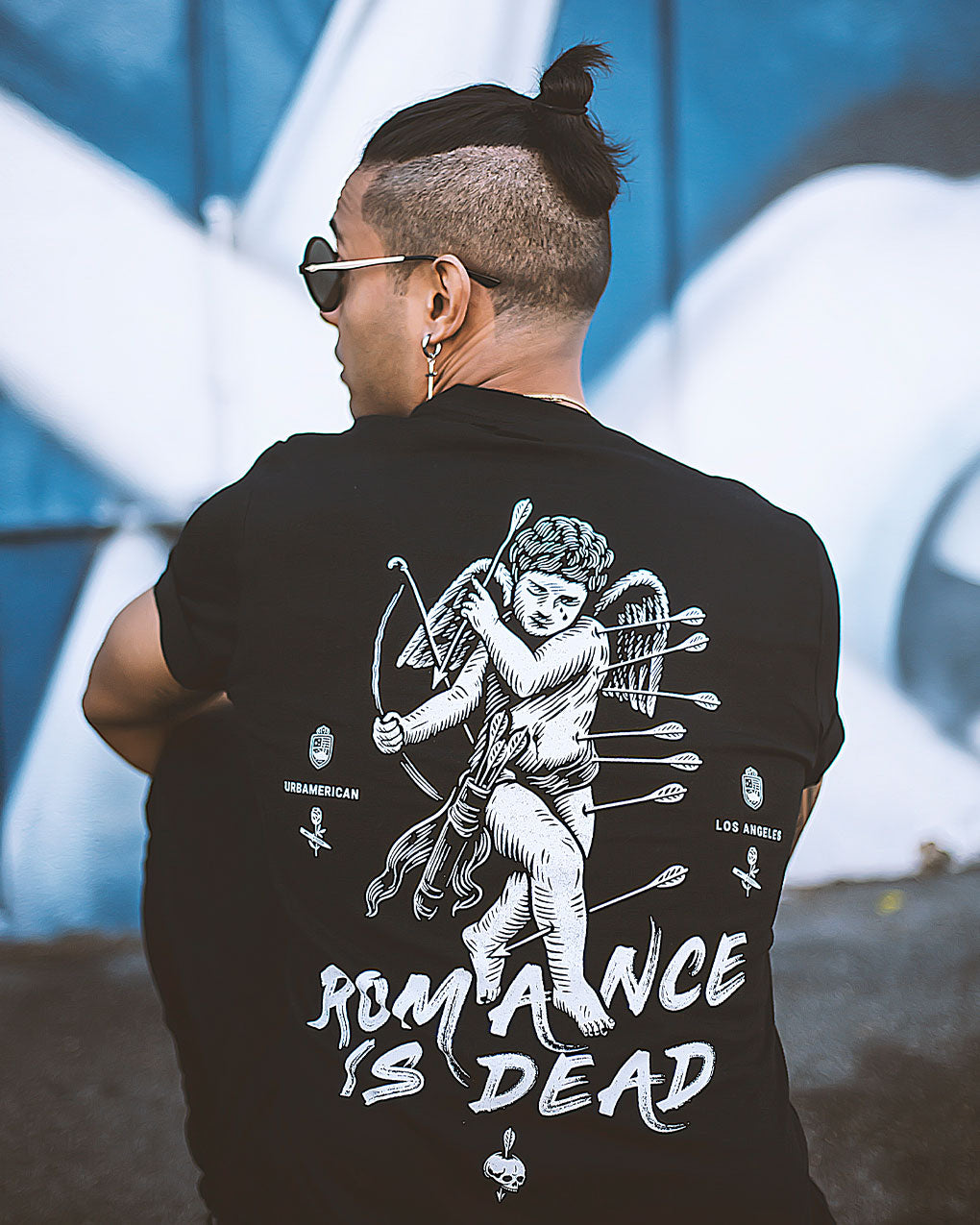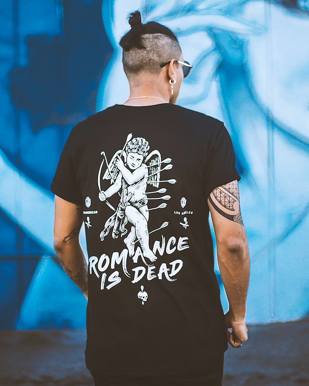 The Romance Is Dead t-shirt is a 100% ringspun cotton t-shirt. Featuring a bold rear graphic print representing modern-day romance. This crewneck tee is inspired by traditional tattoo art with contemporary typography.
