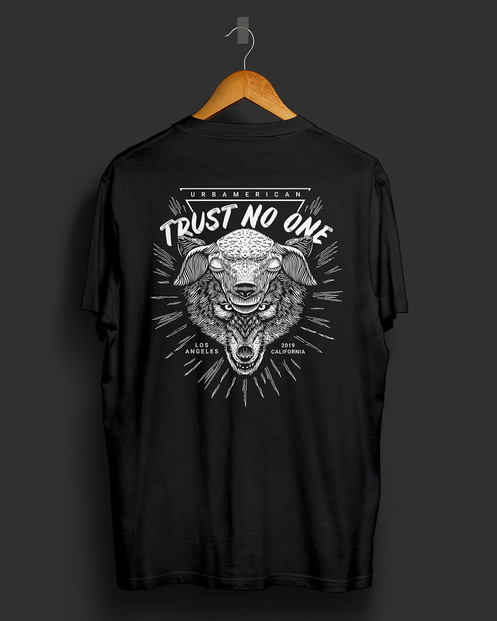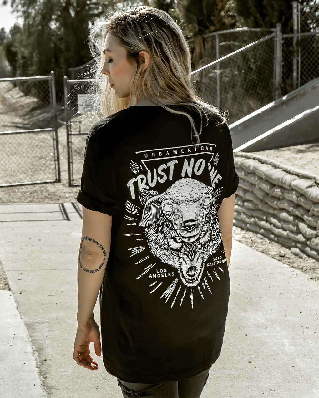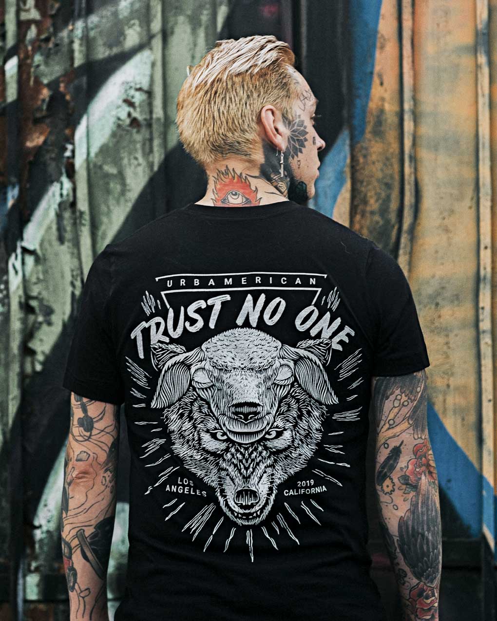 The Trust No One t-shirt is a 100% ringspun cotton crewneck t-shirt. Featuring a bold rear hand drawn graphic print.