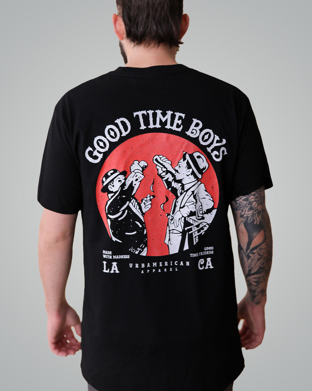 The Good Time Boys t-shirt is a 100% heavyweight cotton ringspun. Featuring a bold rear vintage-inspired graphic print. This crewneck t-shirt is all about the good vibes we get when getting drinks with your pals, cheers to that.