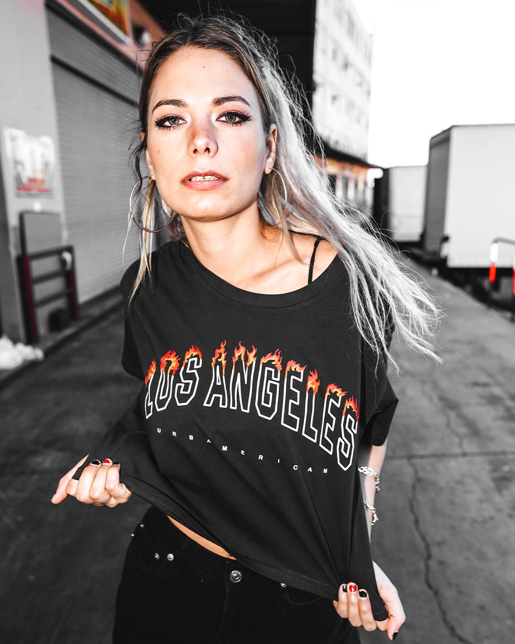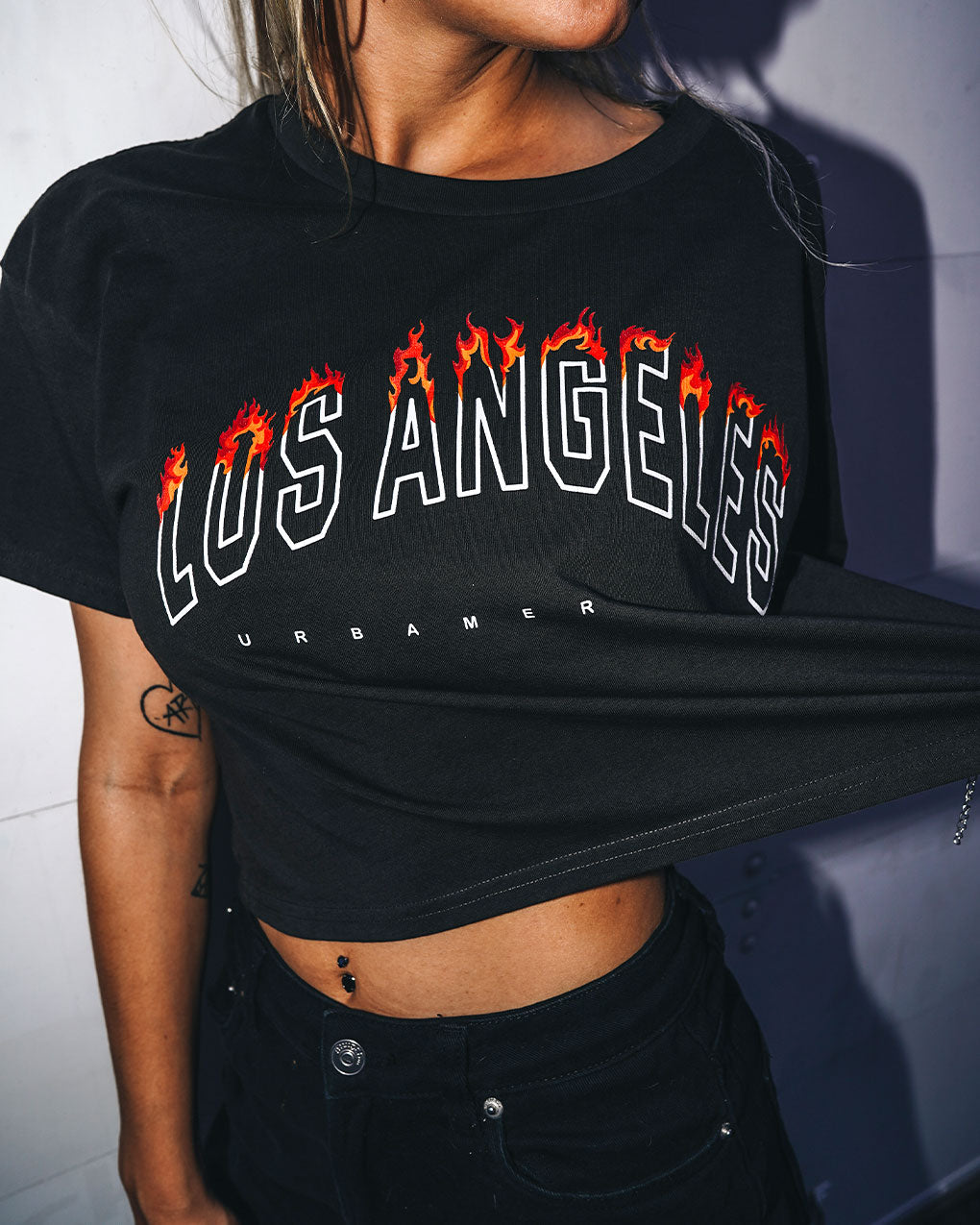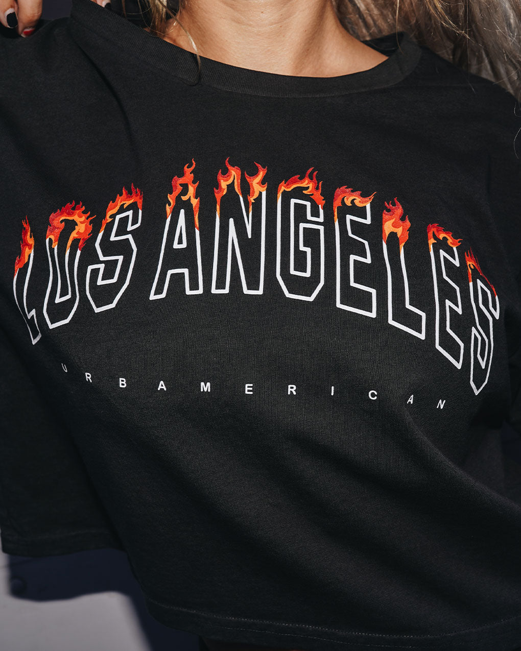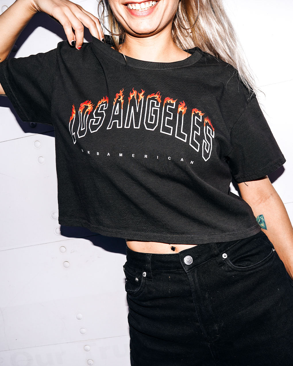 The Los Angeles On Fire gray crop top is a 100% ringspun cotton tee. Featuring a bold graphic font designed with flames, inspired by the classic college American T-shirts with some rock and roll seasoning.